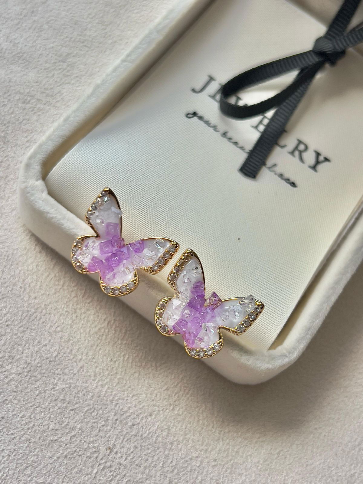 2. Brinco Borboleta Pedra Sal Lilás/Branco em Banho de Ouro