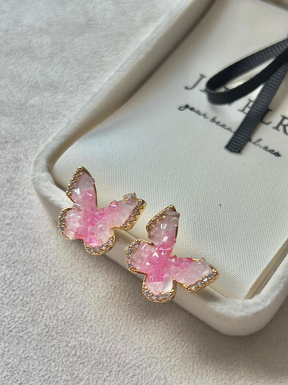 2. Brinco Borboleta Pedra Sal Rosa/Branco em Banho de Ouro