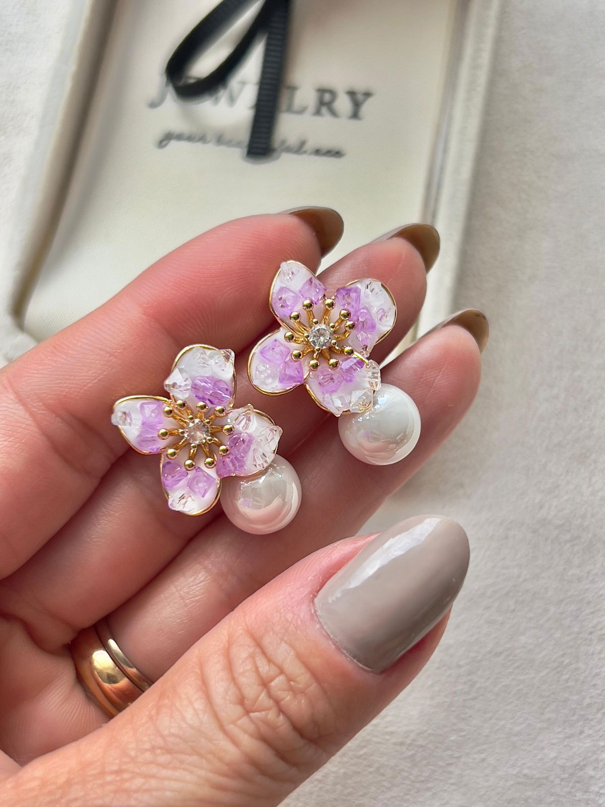2. Brinco Flor com Pérola Shell e Pedra de Sal Lilás/Branco em Banho de Ouro