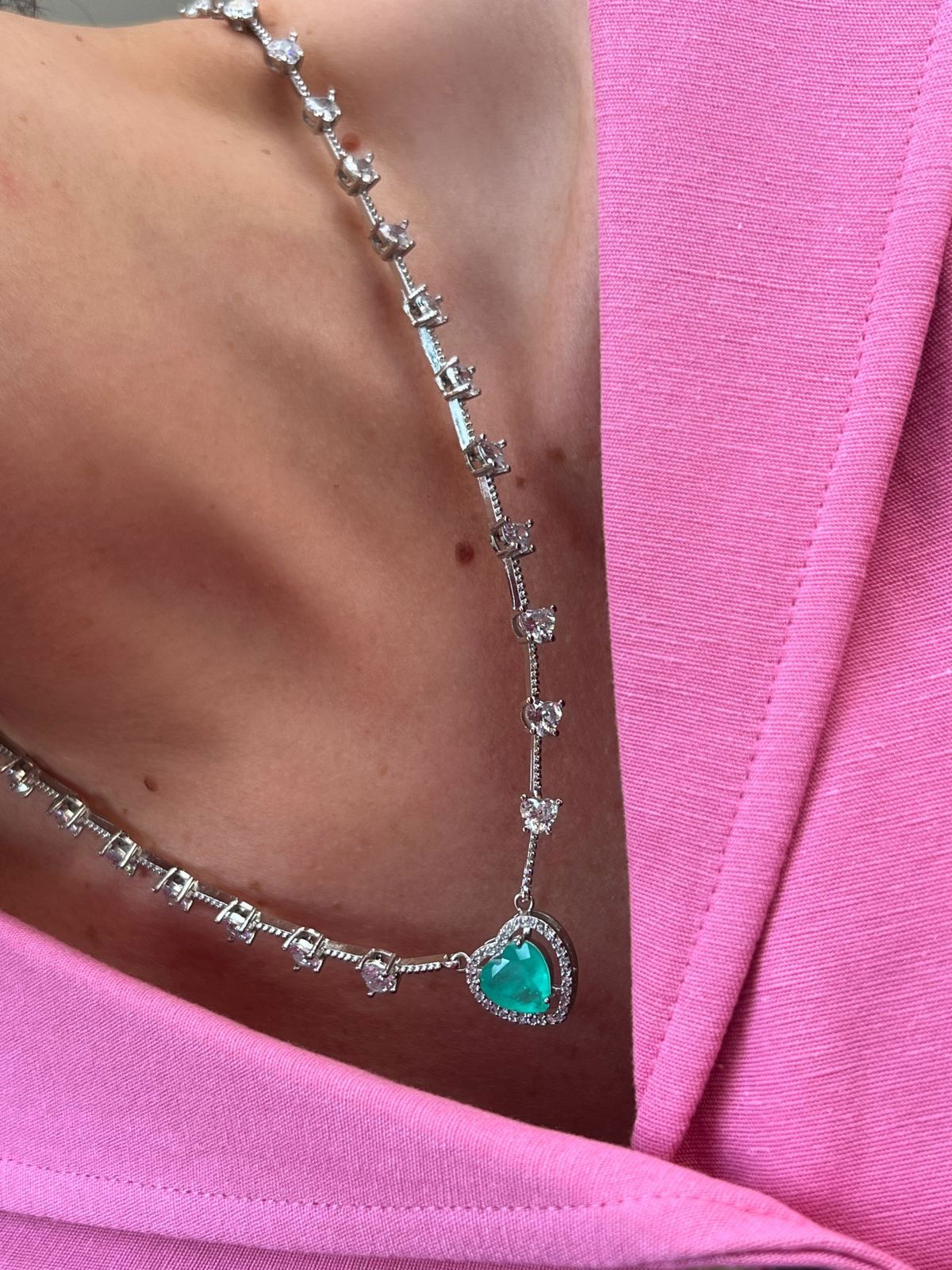 Colar Coração com Zircônia Cristal e Esmeralda Colombiana (Fecho Joia) em Banho de Ródio Branco : Colar768 Facebook X Pinterest WhatsApp : - + : OK × : 1x R$ 0,00 : R$ 0,00 × : -Pedra: -Corrente: 23cm de cada lado -Cor: -Banho: Banho de Ródio Branco (Antialérgico) -Garantia: 1 ano Banho e Zircônia
