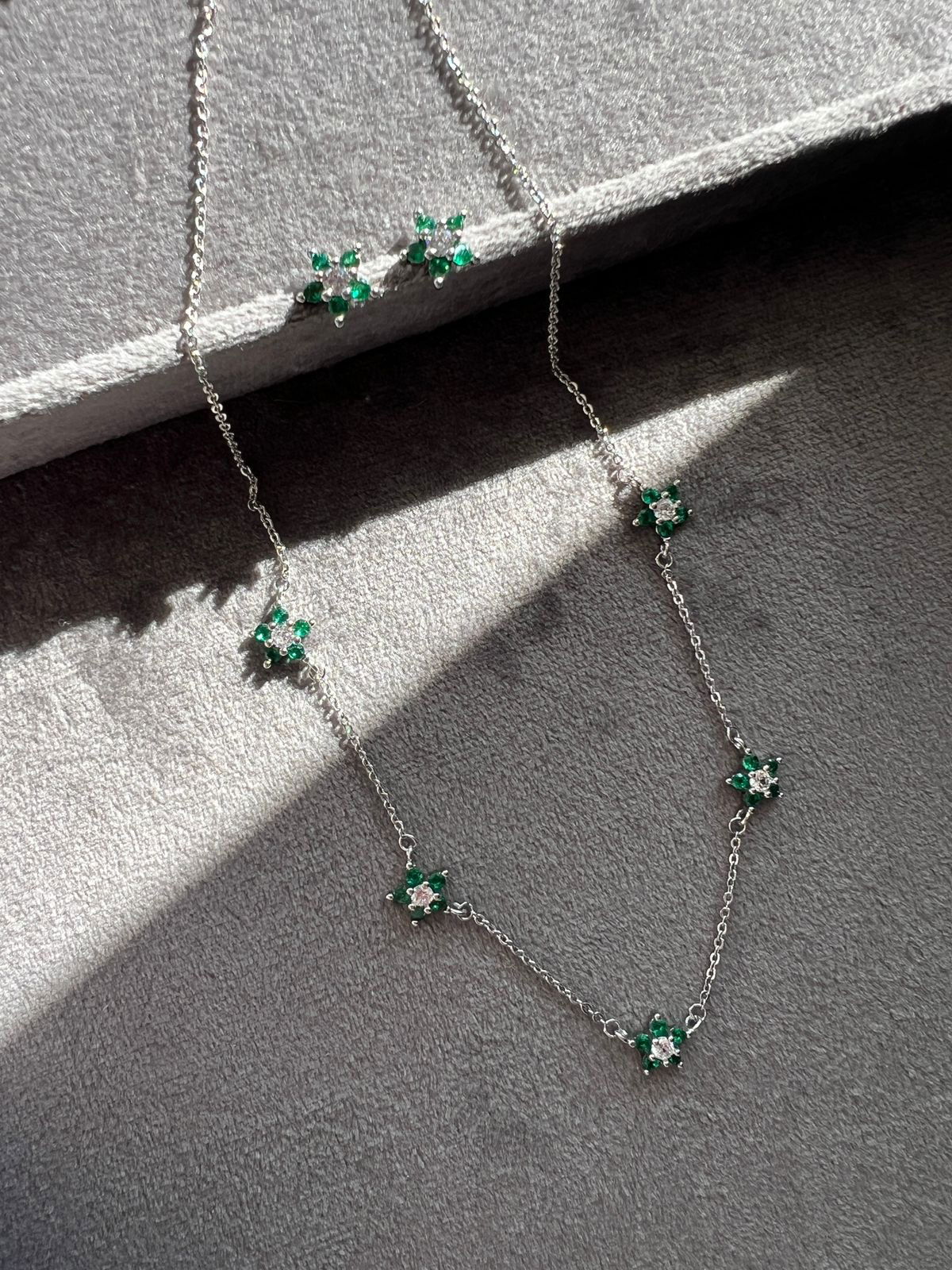 Conjunto com Flores Zircônia Cristal e Verde Esmeralda em Banho de Ródio Branco : Cj766 Facebook X Pinterest WhatsApp : - + : OK × : 1x R$ 0,00 : R$ 0,00 × : -Pedra: -Corrente: -Cor: 45cm + 5cm -Banho: Banho de Ródio Branco (Antialérgico) -Garantia: 1 ano Banho e Zircônia