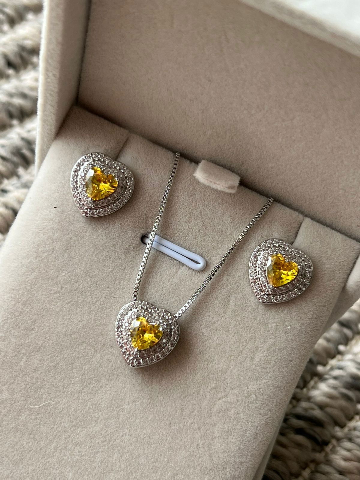 2. Conjunto Coração com Zircônia Cristal e Citrino em Banho de Ródio Branco