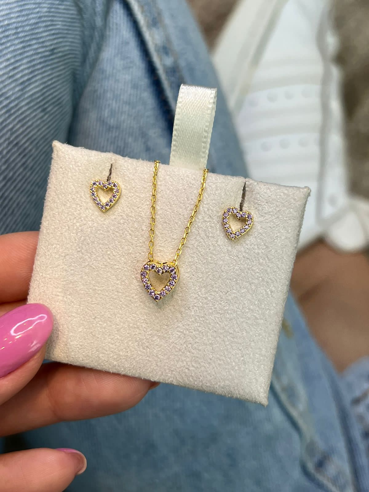 2. Conjunto Coração com Zircônia Lilás em Banho de Ouro