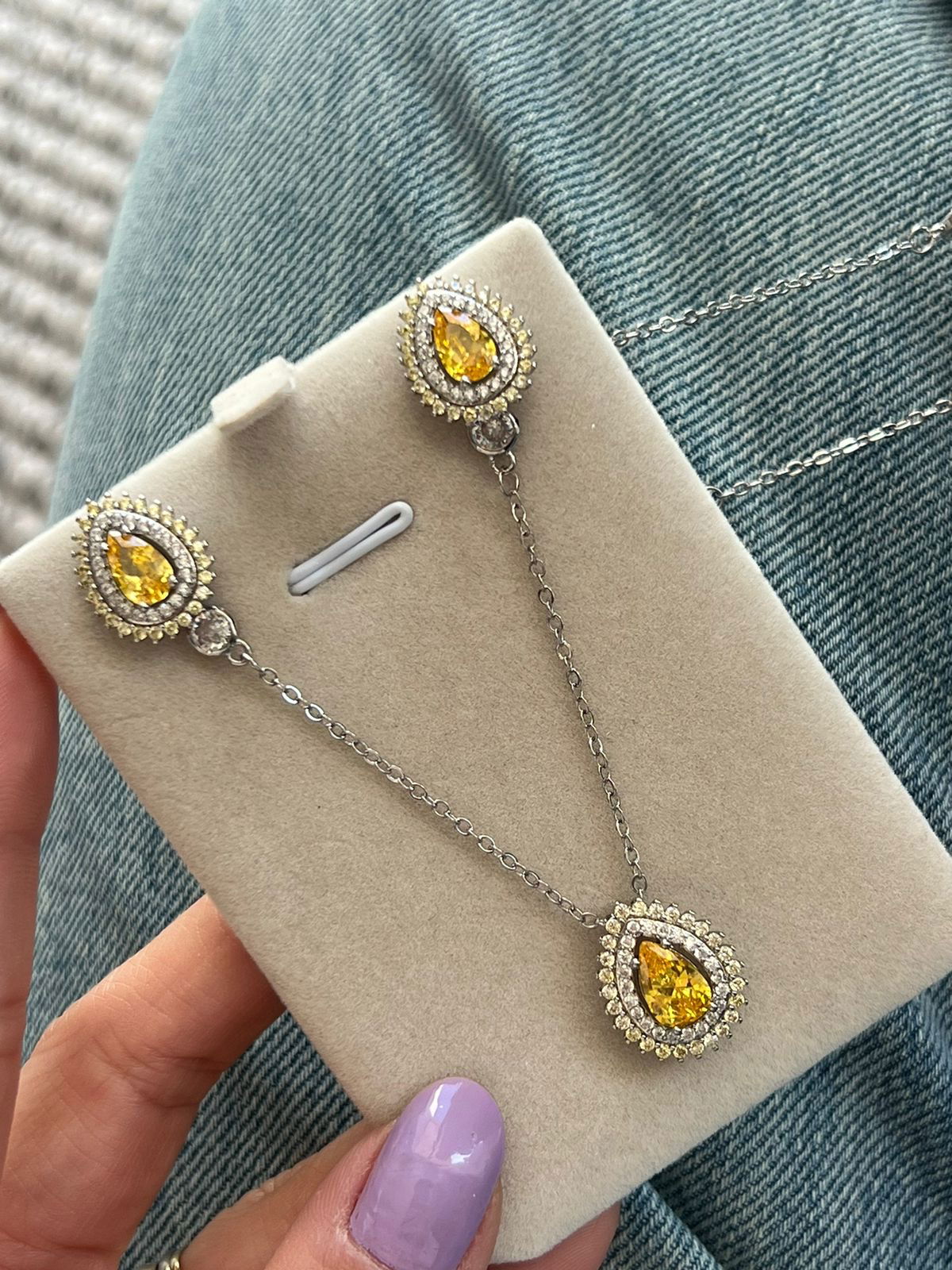 Conjunto Gota com Zircônia Citrino e Cristal em Banho de Ródio Branco : Cj581 5.0 (1) Facebook X Pinterest WhatsApp : - + : OK × : 1x R$ 0,00 : R$ 0,00 × : -Pedra: -Corrente: 45cm + 5cm -Cor: -Banho: Banho de Ródio Branco (Antialérgico) -Garantia: 1 ano Banho e Zircônia