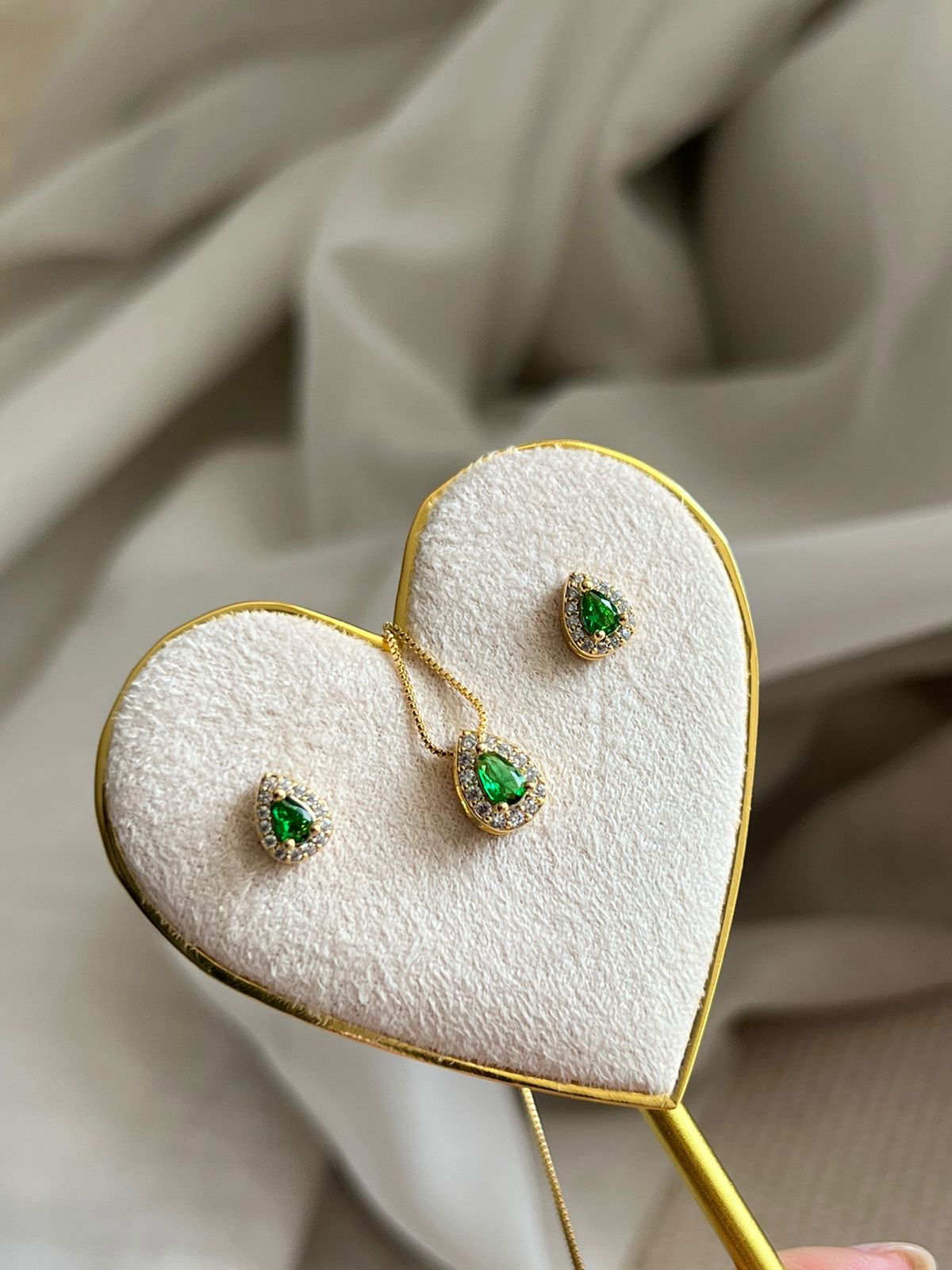 2. Conjunto Mini Gotinha com Zircônia Verde Esmeralda em Banho de Ouro