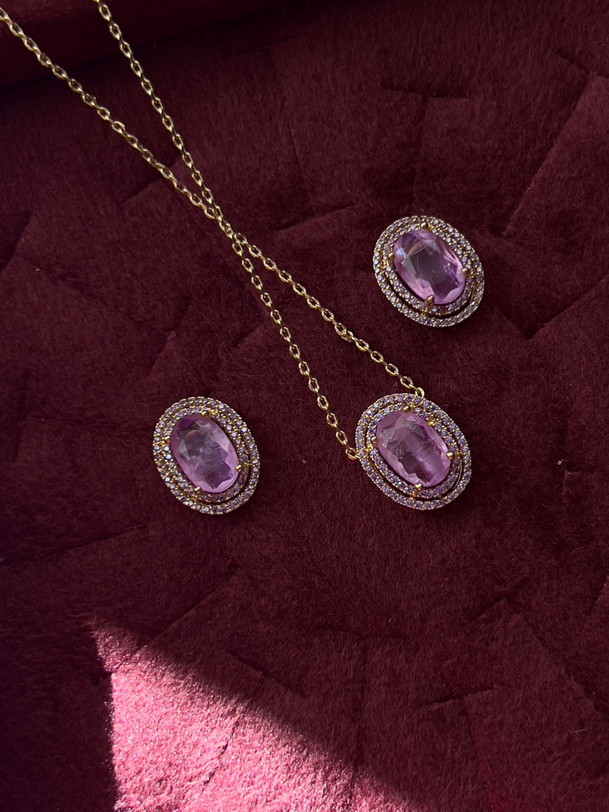 2. Conjunto Oval com Zircônia Lilás em Banho de Ouro
