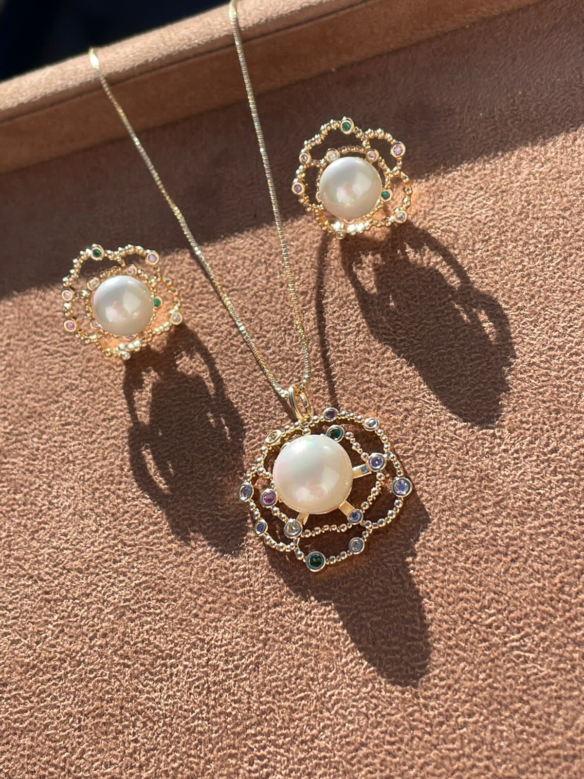 2. Conjunto Rosa com Zircônia Colorida e Pérola em Banho de Ouro