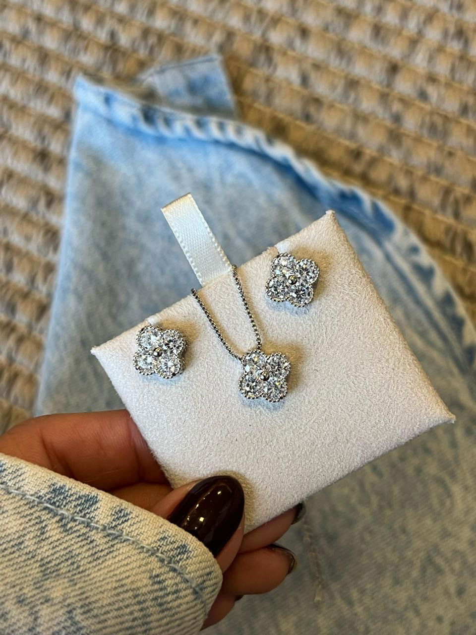 Conjunto Trevo com Zircônia Cristal em Banho de Ródio Branco : Cj705 5.0 (1) Facebook X Pinterest WhatsApp : - + : OK × : 1x R$ 0,00 : R$ 0,00 × : -Pedra: -Corrente: 45cm + 5cm -Cor: -Banho: Banho de Ródio Branco (Antialérgico) -Garantia: 1 ano Banho e Zircônia