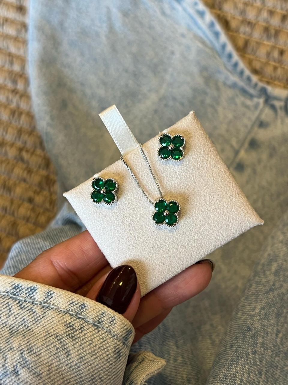 Conjunto Trevo com Zircônia Verde Esmeralda em Banho de Ródio Branco : Cj707 Facebook X Pinterest WhatsApp : - + : OK × : 1x R$ 0,00 : R$ 0,00 × : -Pedra: -Corrente: 45cm + 5cm -Cor: -Banho: Banho de Ródio Branco (Antialérgico) -Garantia: 1 ano Banho e Zircônia