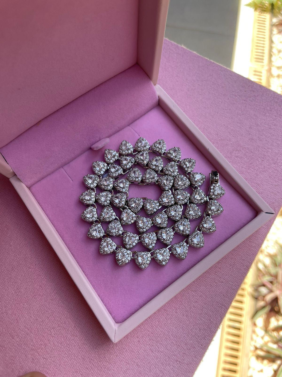 Riviera com Corações Cristal ( Fecho Joia) em Banho de Ródio Branco